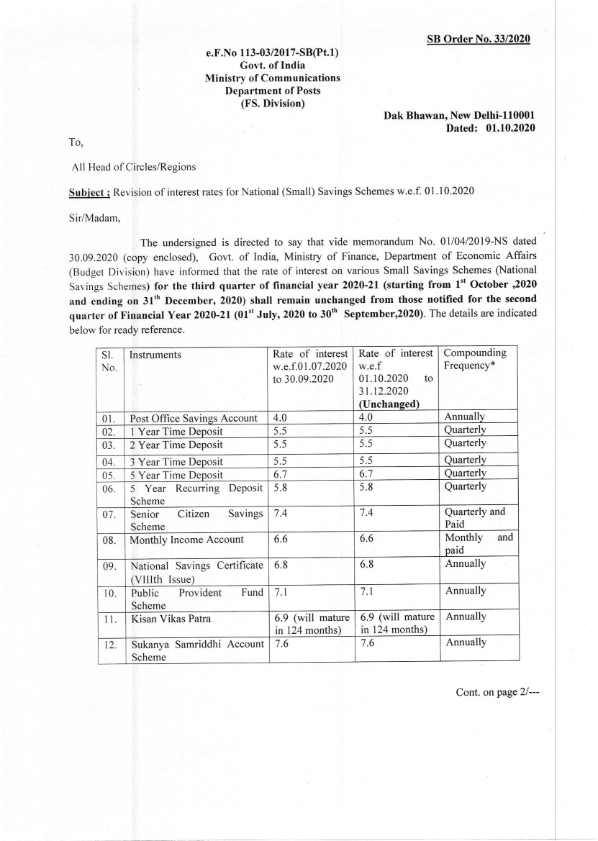 SB Order No. 33/2020 : Revision of interest rates for National (Small) Savings Schemes w.e.f. 01.10.2020 Source : http://utilities.cept.gov....